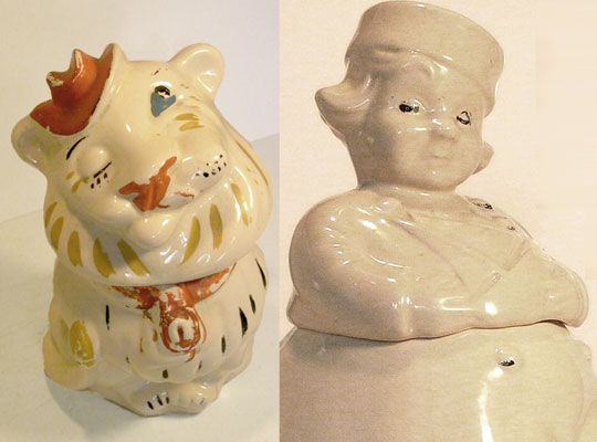 COOKIES OPTIONAL These are my favorite cookie jars, found here there and everywhere. I have been collecting for 12 years and if I had more room, I'd have more jars. All these jars were made in the 1940s, 1950s or 1960s. Not a licensed character or movie tie-in in the bunch. LEFT:BELMONTE LION RIGHT: DUTCH BOY |